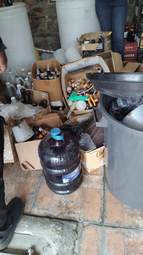 Durante la operación, las autoridades ocuparon cientos de cajas de bebidas alcohólicas (whisky, tequila y ron), conteniendo botellas llenas y vacías, las cuales estaban almacenadas en el segundo nivel del inmueble, distribuidas en tres habitaciones.