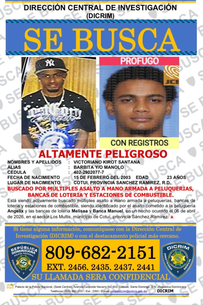 Se trata de Victoriano Kirot Santana, (a) “Barbita” y/o “Manolo”, de 23 años, quien está siendo activamente buscado por su presunta participación en múltiples asaltos a peluquerías, bancas de lotería y estaciones de combustible en esa demarcación.