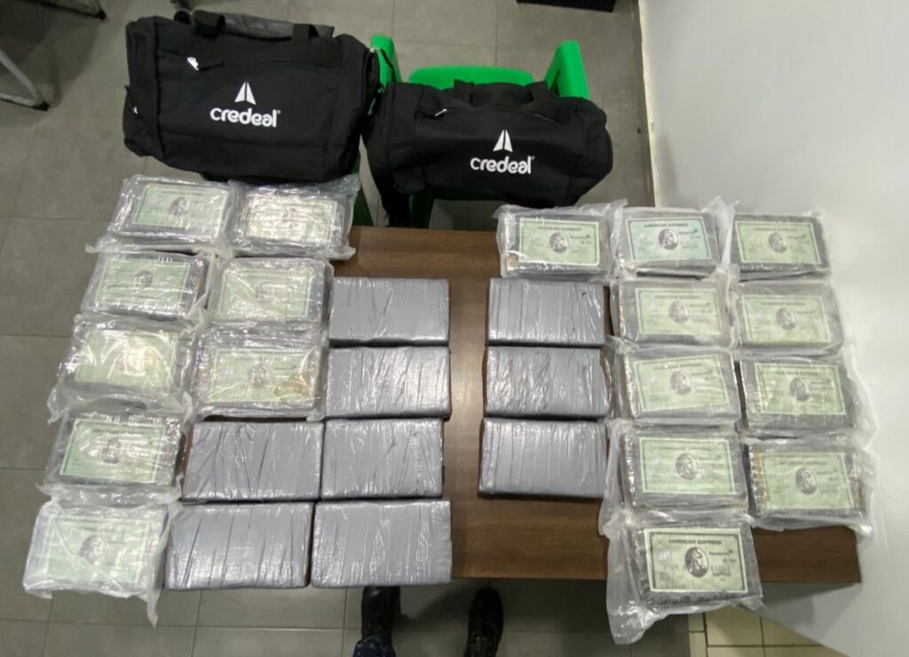 Asimismo, fueron ocupadas como evidencias dos bultos de color negro que contenían la sustancia incautada, cinco tarjetas bancarias (crédito y débito), un cargador portátil y la suma de RD$6,200.00 en efectivo.