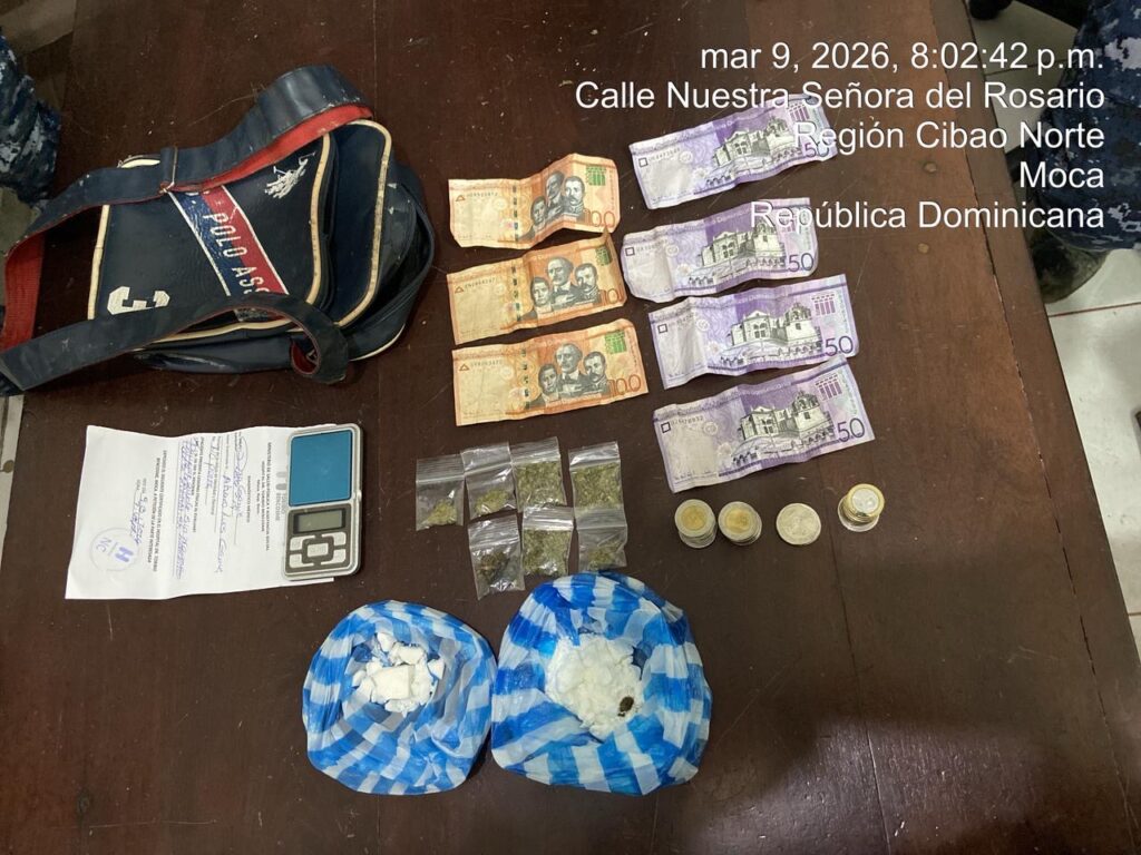 Moca, provincia Espaillat.— Agentes de la Policía Nacional, adscritos a la Unidad Operativa del Departamento Operativo I de la Dirección Regional Espaillat, apresaron en flagrante delito a un hombre al que se le ocuparon presuntas sustancias controladas, dinero en efectivo y otros objetos vinculados a actividades ilícitas, durante una intervención realizada en un supuesto punto de distribución de drogas en el sector Villa Bartola, de esta ciudad.