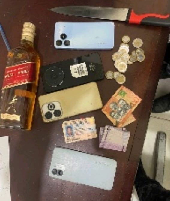 Al momento de su arresto, los agentes ocuparon a uno de los detenidos un cuchillo, cuatro teléfonos celulares de distintas marcas y modelos, y un litro de whisky. Las autoridades activaron la búsqueda de un cuarto implicado, quien logró escapar del lugar cargando con el dinero sustraído.