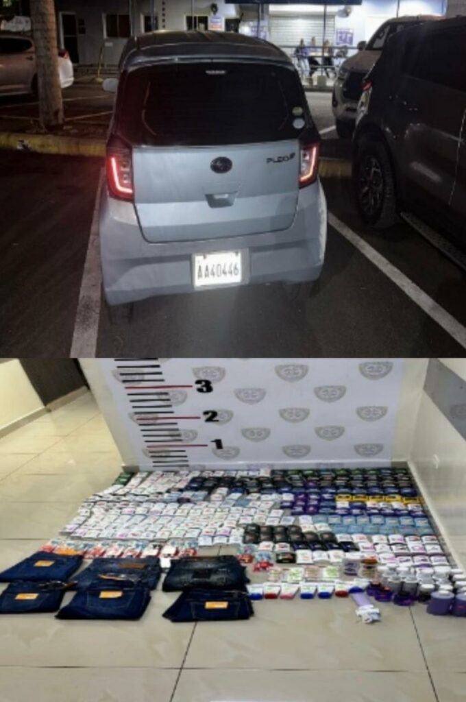 Los detenidos fueron sorprendidos a bordo de un vehículo Subaru, modelo Pleó, color azul claro, año 2018, placa AA40446, en la calle Felipe Vicini Perdomo, esquina Daniel Henríquez, donde, al ser requisado el baúl del automóvil, se ocupó un saco color verde que contenía diversas mercancías presuntamente sustraídas, entre ellas pantalones, desodorantes, cepillos dentales, cremas, jabones y otros artículos.