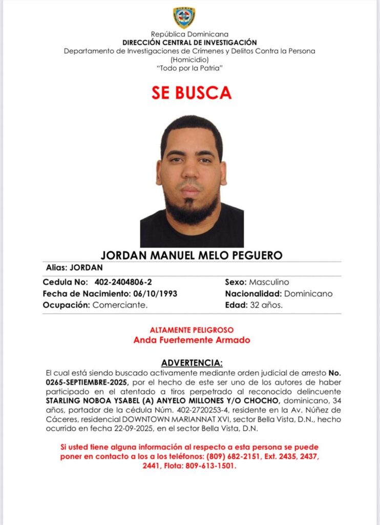 La Policía Nacional, a través del Departamento de Investigaciones de Crímenes y Delitos Contra la Persona (Homicidios), informó que fueron identificados y se mantienen activamente buscados tres hombres señalados como presuntos autores del atentado a tiros perpetrado contra Starling Noboa Ysabel, alias “Anyelo Millones” y/o “Chocho”, hecho ocurrido el pasado 22 de septiembre en el sector Bella Vista, del Distrito Nacional.